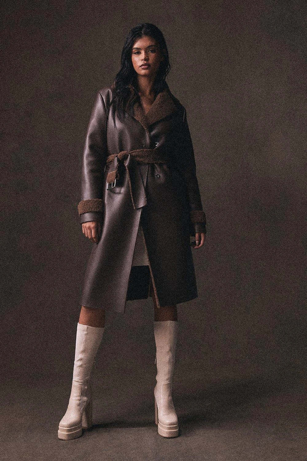 Leather Look Belted Teddy Lined Coat