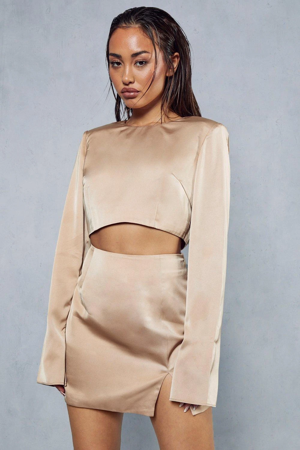 Premium Satin Shoulder Pad Split Skirt Co-ord